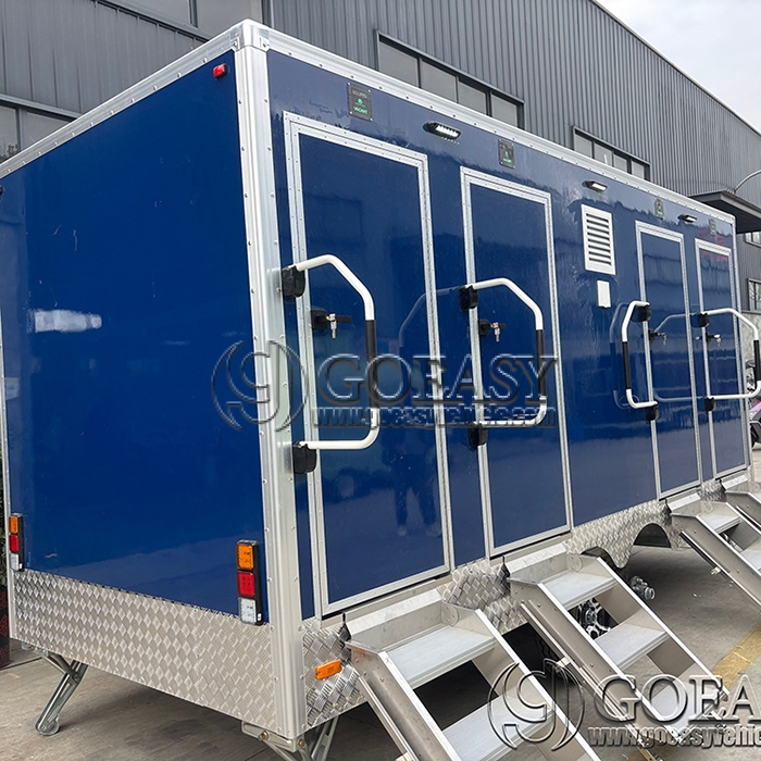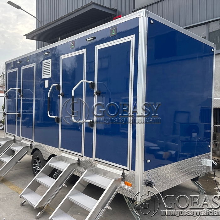 The 4 station blue luxury restroom trailer is a robust, trailer-mounted unit designed to accommodate four users simultaneously. Its striking blue exterior, reinforced with aluminum diamond plating, ensures durability and weather resistance, while the sleek metal trim adds a touch of modernity. Equipped with staircases for easy access and sturdy wheels for mobility, this trailer is engineered for quick deployment at venues ranging from outdoor weddings to disaster relief zones.