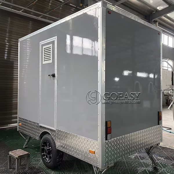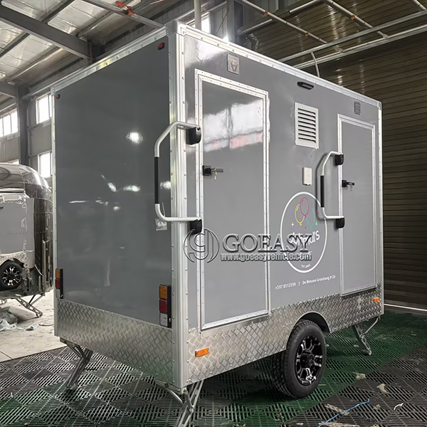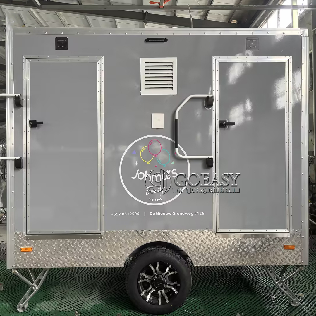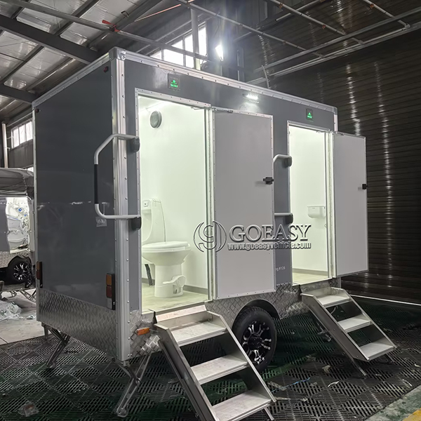 The 2-station gray portable restroom trailer is a compact, self-contained sanitation unit designed to provide clean and comfortable restroom facilities in remote or temporary locations. With its sleek gray exterior and two private stations, this trailer offers a practical solution for events, construction sites, and outdoor gatherings where permanent restrooms are unavailable. Built for durability and ease of transport, it ensures users have access to hygienic amenities wherever needed.