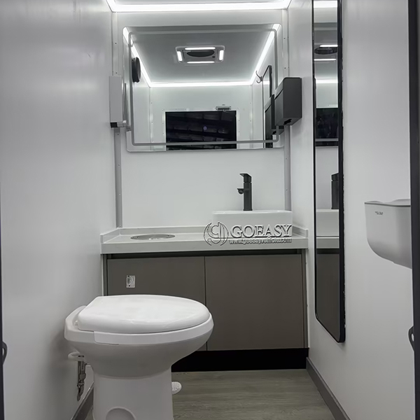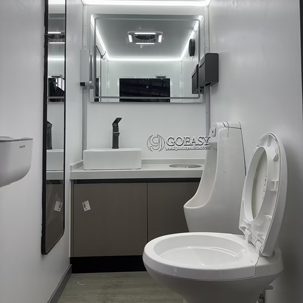 Two Private Stations: Includes two separate restroom compartments, each equipped with a toilet, sink, and mirror, allowing multiple users simultaneously while maintaining privacy.